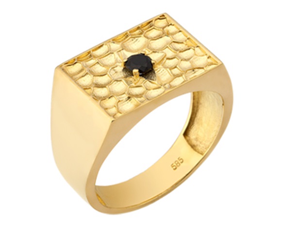 Ανδρικό δαχτυλίδι από κίτρινο χρυσό 14 καρατίων σε λουστρέ φινίρισμα. Ένα ιδιαίτερο ορθογώνιο σχέδιο με ανάγλυφη επιφάνεια που το κοσμεί στο κέντρο μια μαύρη πέτρα ζιργκόν.Μια μοναδική επιλογή για ένα ξεχωριστό δώρο.