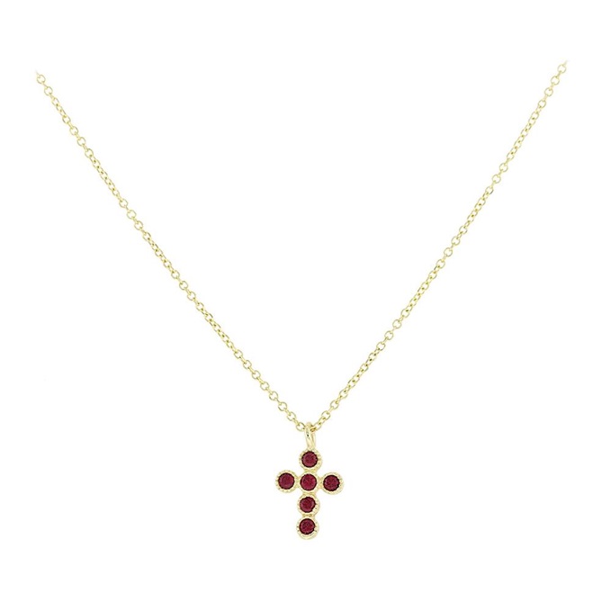 Χρυσό κολιέ 14 καράτια με σταυρό διακοσμημενο με κόκκινες πέτρες ζιργκόν.