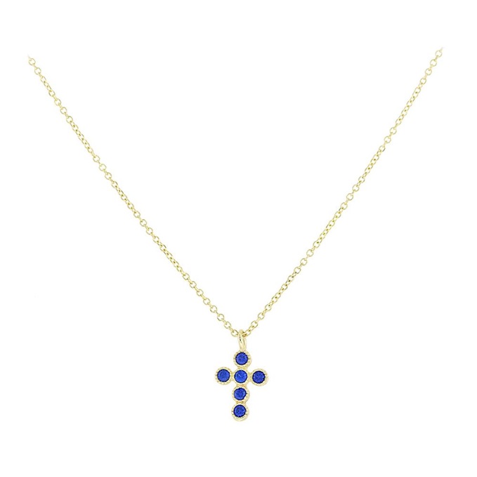 Χρυσό κολιέ 14 καράτια, με σταυρό διακοσμημενο με μπλέ πέτρες ζιργκόν. Ιδανικό για όλες τις ώρες της ημέρας.