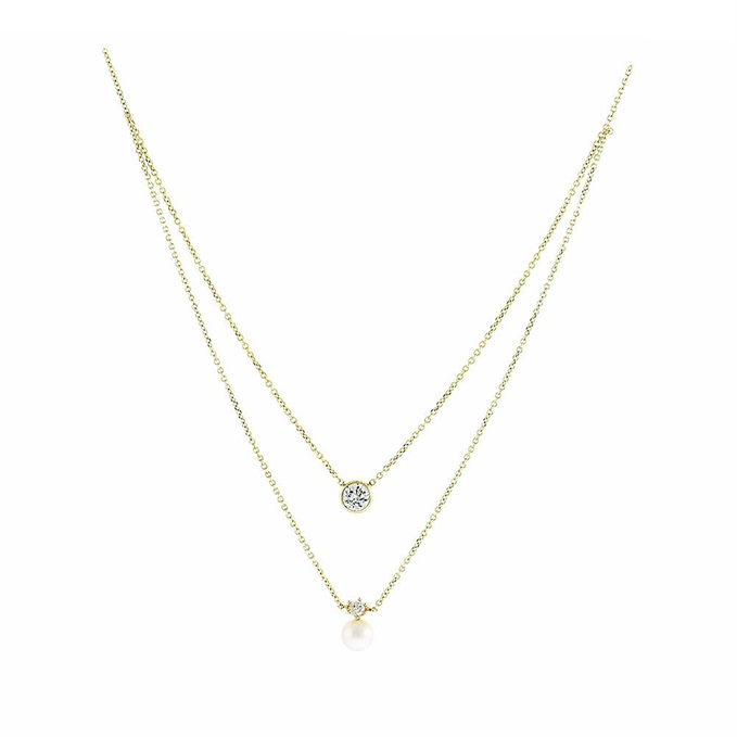 Διπλό κολιέ χρυσό 14 καράτια με στρόγγυλο ζιργκόν στην πάνω αλυσίδα και ένα μαργαριτάρι με λευκό ζιργκόν στην δεύτερη αλυσίδα.Ένα ξεχωριστό δώρο για την αγαπημένη σας.