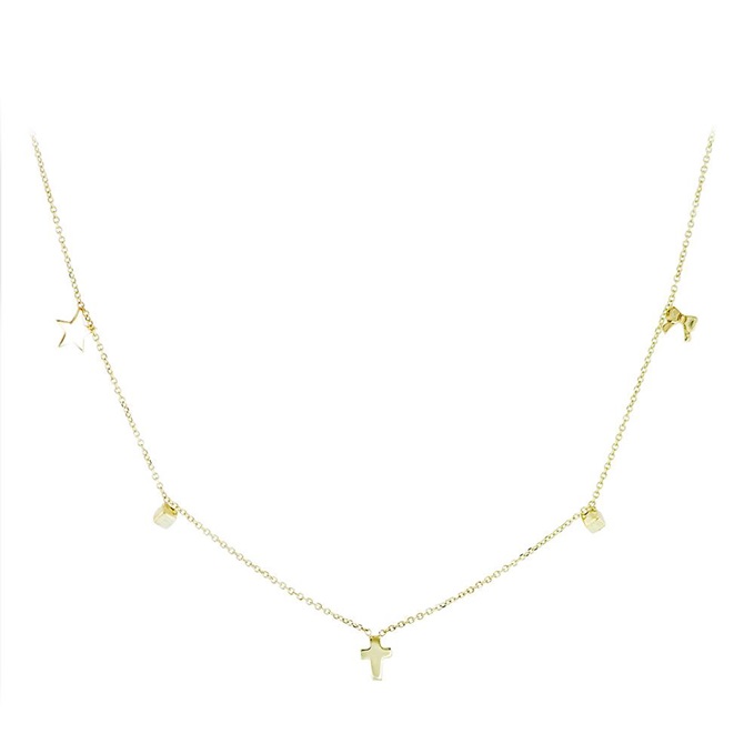 Κολιέ Χρυσό 14 καράτια με μοτίφ χρυσά σε σχήματα αστέρι, σταυρό, κύβους και φιογκάκι, με λουστρέ φινίρισμα.Ιδανικό δώρο για γενέθλια ή γιορτή!