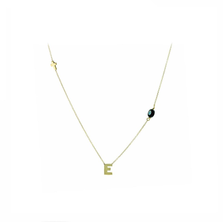 Κολιέ χρυσό 14 καράτια με το μονόγραμμα Ε , στο κέντρο της αλυσίδας , ένα μικρό λουστρέ σταυρό από την μία πλευρά και ένα μάτι φίλντισι από την αλλη πλευρα,σε μαύρο χρώμα.Εξαιρετική επιλογή για ένα προσωποποιημένο δώρο.