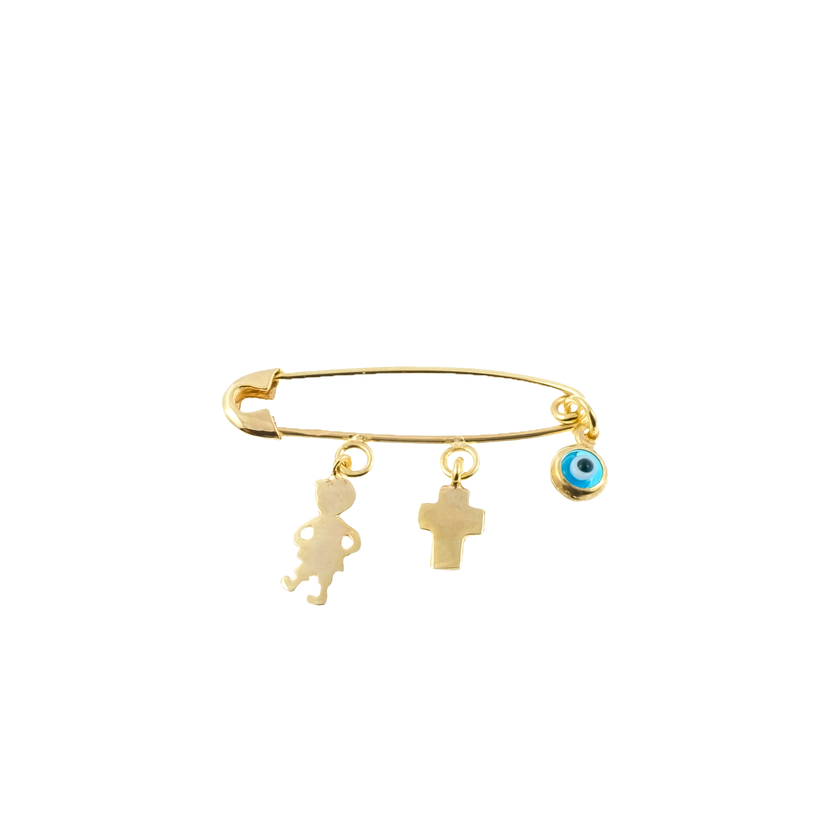 Παιδική παραμάνα από κίτρινο χρυσό 9 καρατίων σε υπέροχο σχέδιο με αγοράκι,σταυρουδάκι και ένα ματάκι.Μια παραμάνα που μπορεί να κοσμεί τα μπλουζάκια του αγοριού σας όλη την ημέρα.