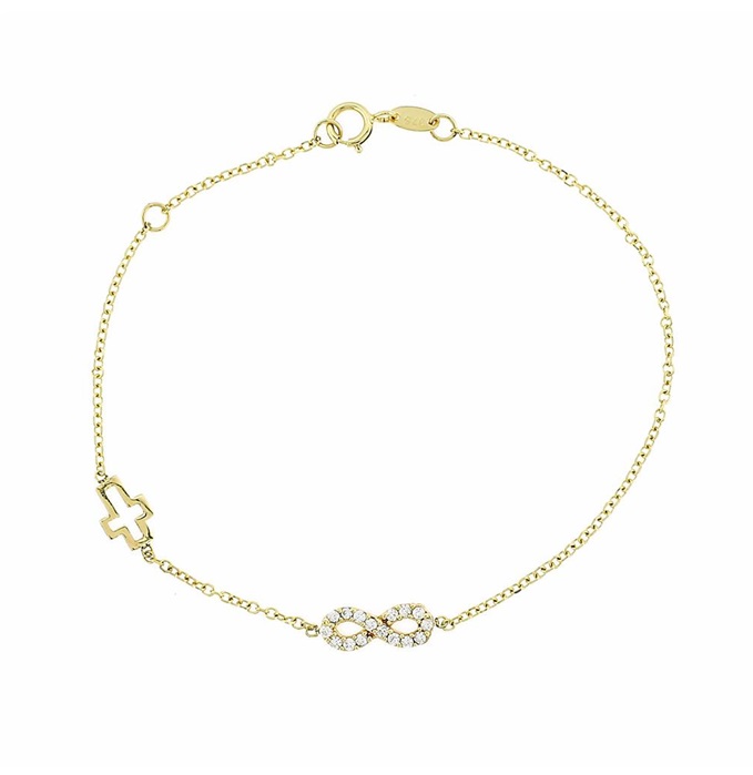 Βραχιόλι από κίτρινο χρυσό με άπειρο διακοσμημένο με λευκές πέτρες ζιργκόν και ένα διάτρητο σταυρό με λουστρέ φινίρισμα.Ιδανική επιλογή για να δώσετε λάμψη σε κάθε εμφάνισή σας.