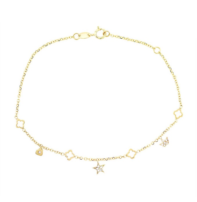 Βραχιόλι χρυσό 14 καράτια με διάτρητα σταυρουδάκια και κρεμαστά μοτίφ,μία καρδούλα, ένα αστεράκι και μία κορώνα, διακοσμημένα με λευκές πέτρες ζιργκόν.Ένα κόσμημα για όλες τις ώρες της μέρας.